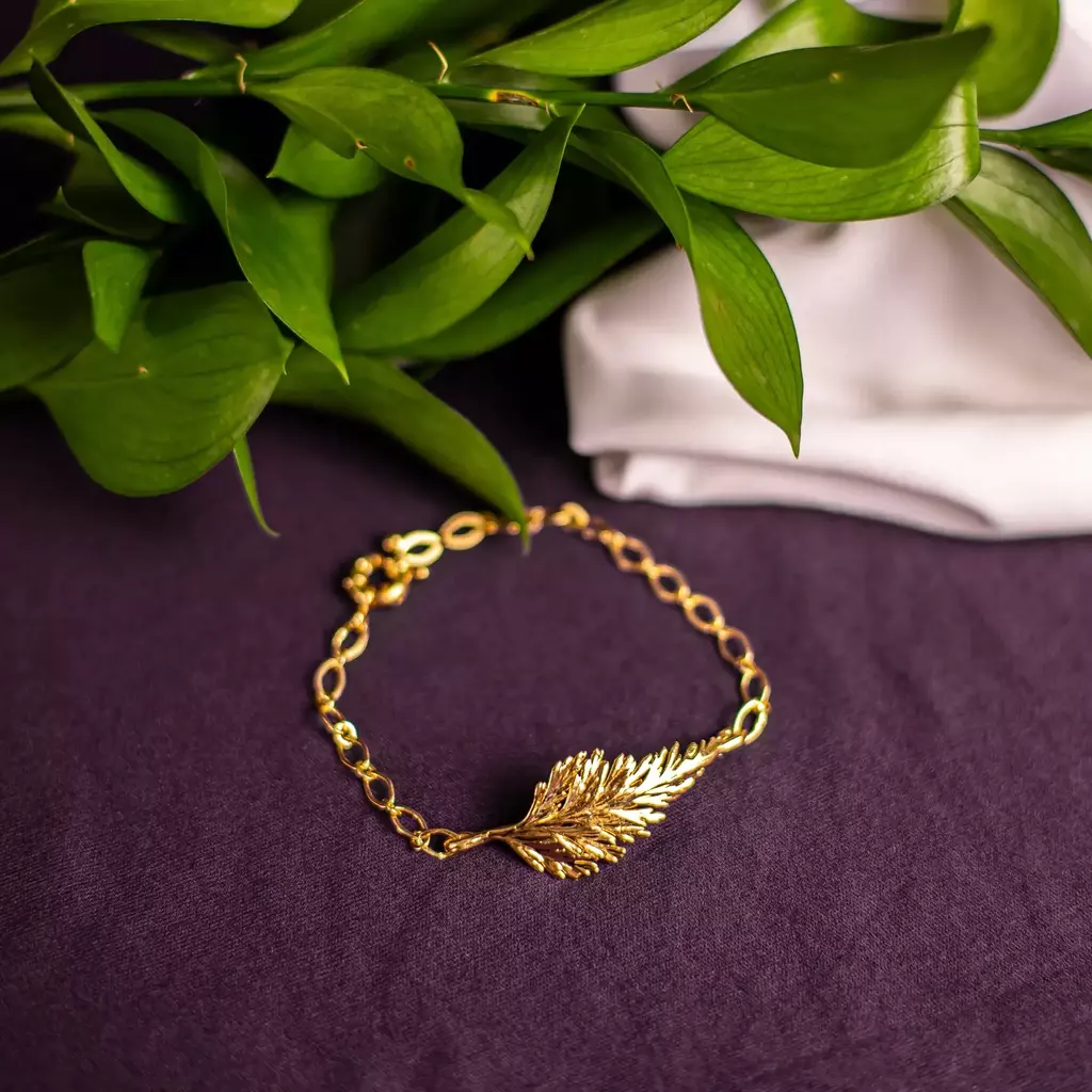 Vista de frente, impressiona pela folha majestosa. De lado, surpreende pela fluidez. É a pulseira que muda conforme você se move - ora destaque botânico, ora corrente elegante. Para dias que pedem presença sem obviedade, sofisticação sem esforço.